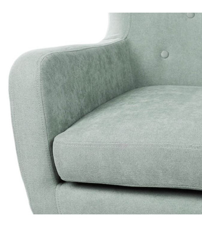 Armchair made from dark gray upholstered fabric with button detail on the back.