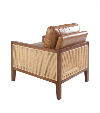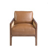 Armchair with armrests, seat and back upholstered in brown cowhide leather. Feet in walnut-colored wood.