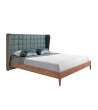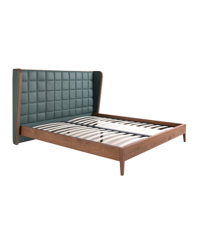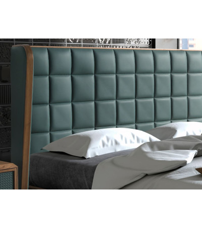 Double bed with headboard covered in eco-leather and wooden frame veneered in natural walnut. Includes a multi-bed base made of pine wood.