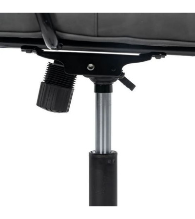 Office chair with wheels, metal structure and camel colored synthetic leather upholstery.