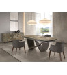 Modern design chair with arms, seat and back upholstered in synthetic leather and walnut-colored wooden legs, with its avant-garde and timeless style
