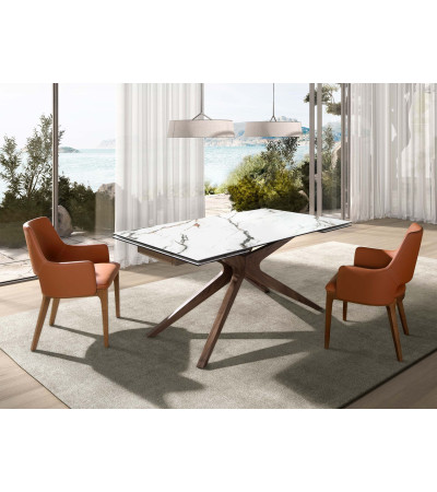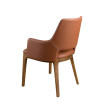 Modern design armchair with seat and back upholstered in synthetic leather and legs in natural walnut veneer, with an avant-garde and timeless style