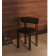 Chair with solid oak wood frame with black finish. Backrest and seat covered in fabric.