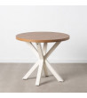 Dining table with tempered glass top and walnut wood legs with steel base.
