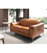 Relaxing sofa with a modern design, upholstered in cowhide, with a headrest for greater comfort and honey-colored wooden legs. Its two electric relaxation systems provide the extra comfort you need to relax