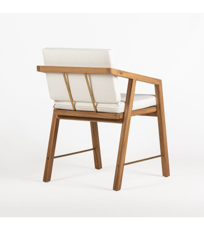 Cadeira em madeira de teca com encosto e assento em tecido.