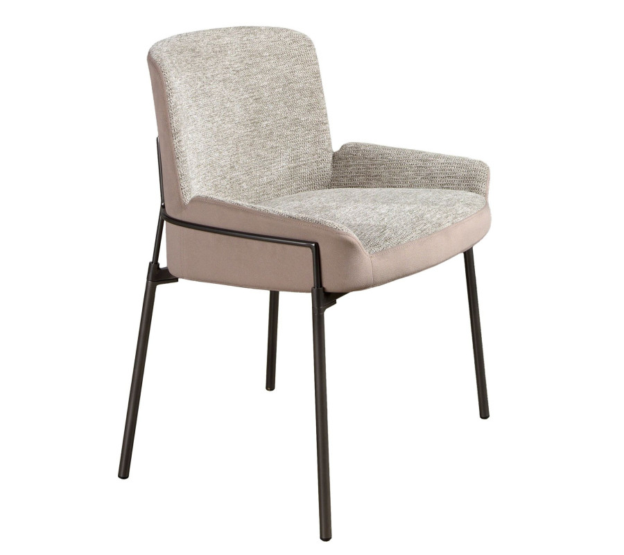 Cadeira de design moderno com assento estofado em tecido cinzento e encosto estofado em tecido de veludo e as suas pernas em aço inoxidável escurecido com um estilo vanguardista