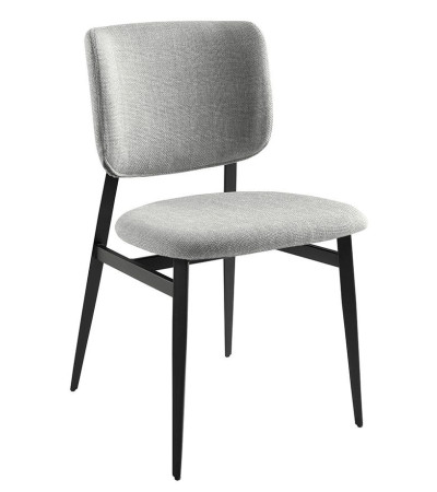 Cadeira com estrutura de aço inoxidável cor preta e estofo em tecido cinza claro