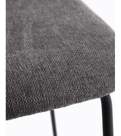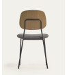 Cadeira com assento revestido em tecido e encosto em madeira de carvalho acabamento natural. Estrutura em metal acabamento pintado preto mate.
