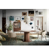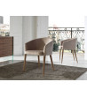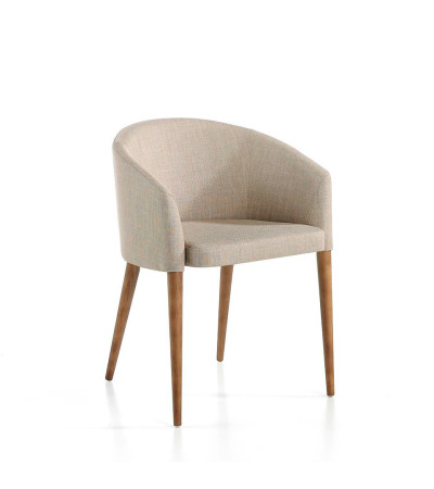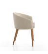 Cadeira de jantar estofada em tecido com braços e pernas em madeira de freixo cor de nogueira