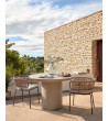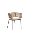 Cadeira com pés em aço galvanizado e encosto em corda apta para uso interior ou exterior.