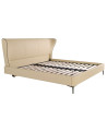 Cama de casal com cabeceira feita de couro sintético e estrutura revestida em tecido, com pernas de aço inoxidável cromado. Inclui uma base de cama multibase feita de madeira de pinho.