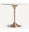 Mesa de bar redonda feita em porcelanato combinado com aço dourado