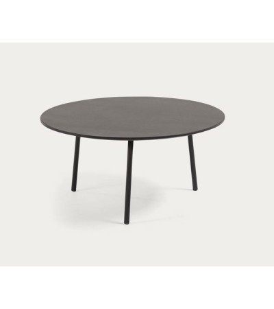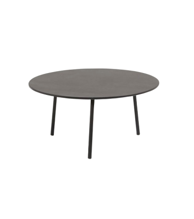 Mesa de centro com tampo de fibra de cimento com acabamento preto. Pés de aço galvanizado, resistente à abrasão e à corrosão, pintado com um acabamento preto por meio de pulverização. Proteções de plástico nos pés para não danificar nem riscar o chão. Apta para interiores e exteriores cobertos.