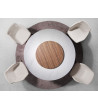 Mesa de jantar redonda com tampo fixo em mármore com acabamento brilhante, pés em madeira de nogueira natural e centro rotativo