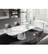 Mesa de jantar oval com tampo fixo em mármore com acabamento brilhante e pés em aço