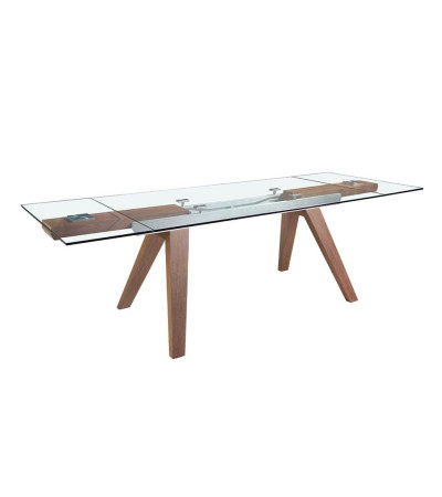 Mesa de jantar extensível retangular com tampo de vidro temperado e pés em madeira folheada a nogueira natural