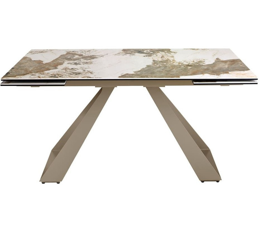 Mesa de jantar extensível retangular com tampo em mármore com acabamento brilhante e pés em aço inoxidável