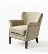 Poltrona de madeira em tom natural com assento estofado cinza e encosto em ripas de rattan natural. Este design de poltrona é espaçoso e esteticamente leve, graças às linhas retas dos braços e às cavidades nos braços e no encosto.