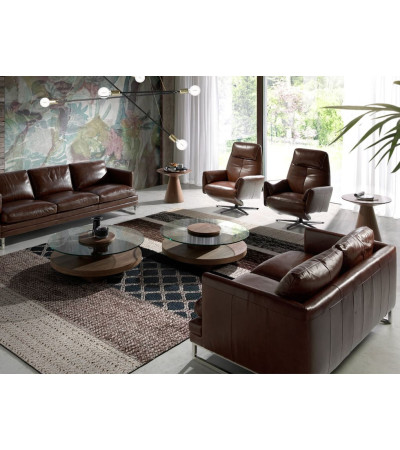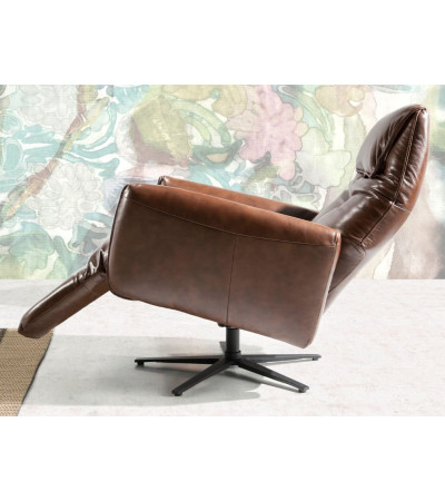 Poltrona giratória com dois mecanismos relax elétricos independentes, estofada em couro bovino com estrutura interna em madeira de pinho e base sólida em aço pintado em epóxi preto.