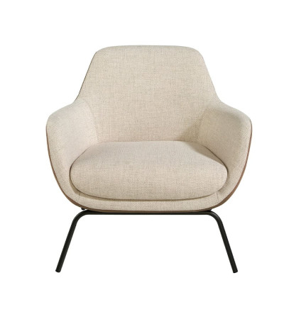 Poltrona revestida em tecido e costas em couro ecológico. Estrutura de pernas em aço inoxidável preto
